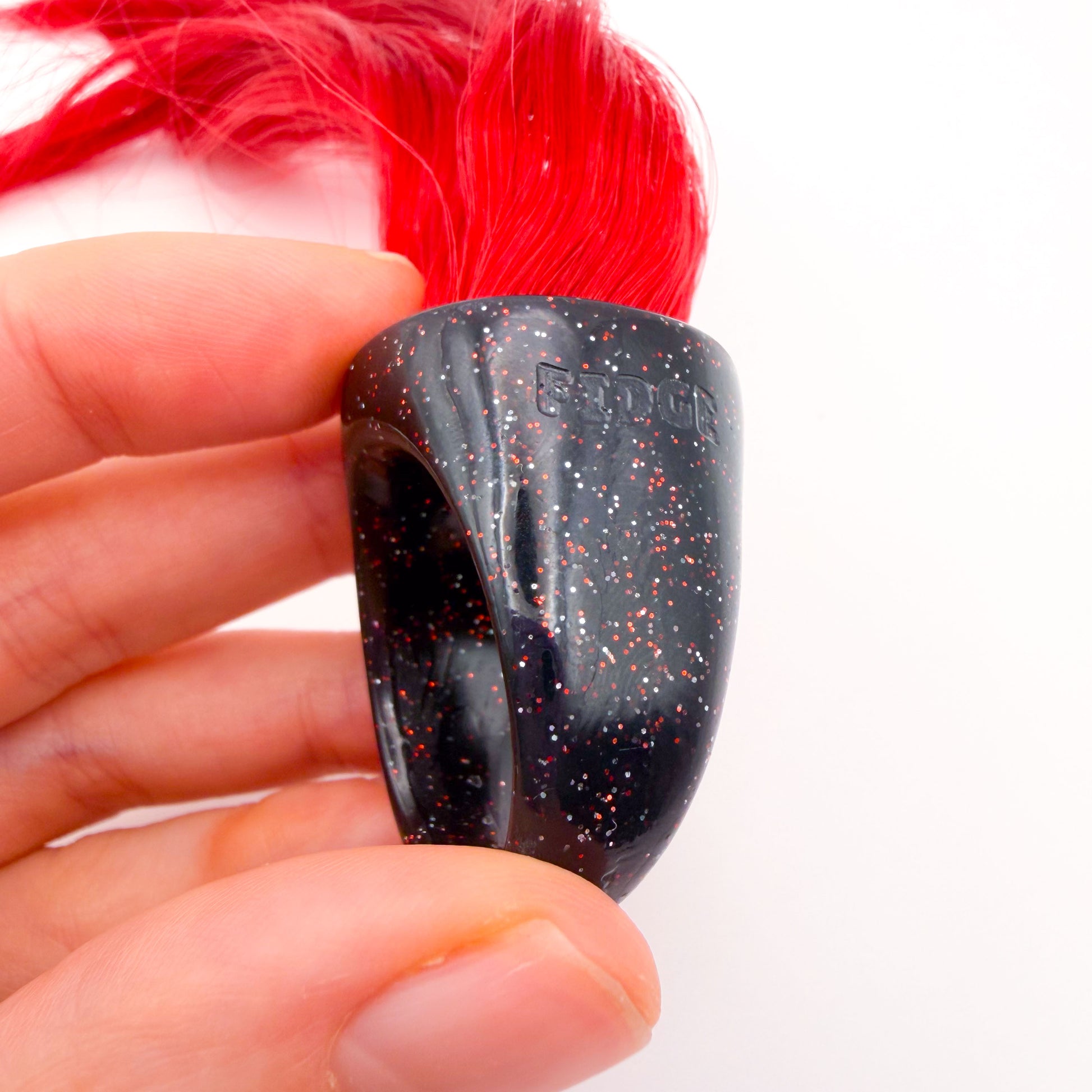 This Black Cherry design features a black ring, silver and red glitter with red hair. It also has the Fidge logo engraved on the side! :)