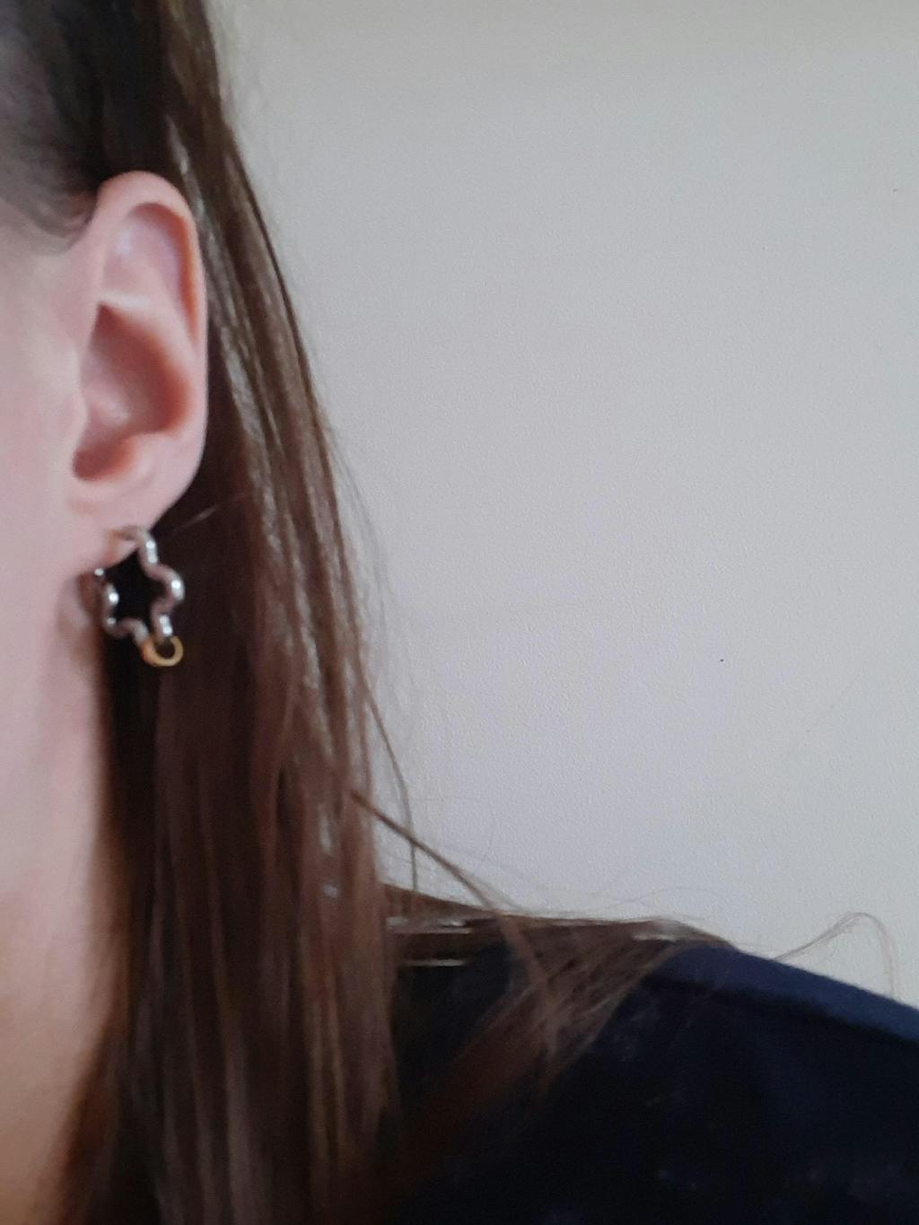 It's made out of 304 Stainless Steel so won't tarnish, rust etc. It's also waterproof! This is the silver colour Stainless Steel with a gold colour stainless steel bead. Width of earring from left to right 2cm.